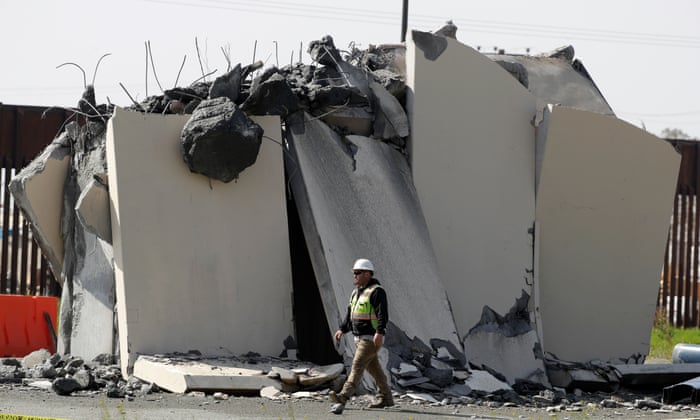 | A worker passes a partially demolished border wall prototype during demolition at the border between Tijuana, Mexico, and San Diego on 27 February 2019. Photograph: Gregory Bull/AP |